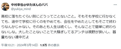 中村氏は「高校に落ちたぐらい別にどうってことないこと。そもそも学校に行かなくても、途中で学校に行くのをやめても、会社をやめたとしてもそこで終わりなんかじゃない。そのあとも人生は続くし、そんなことで簡単に終わらないしな」との考えを示した。
