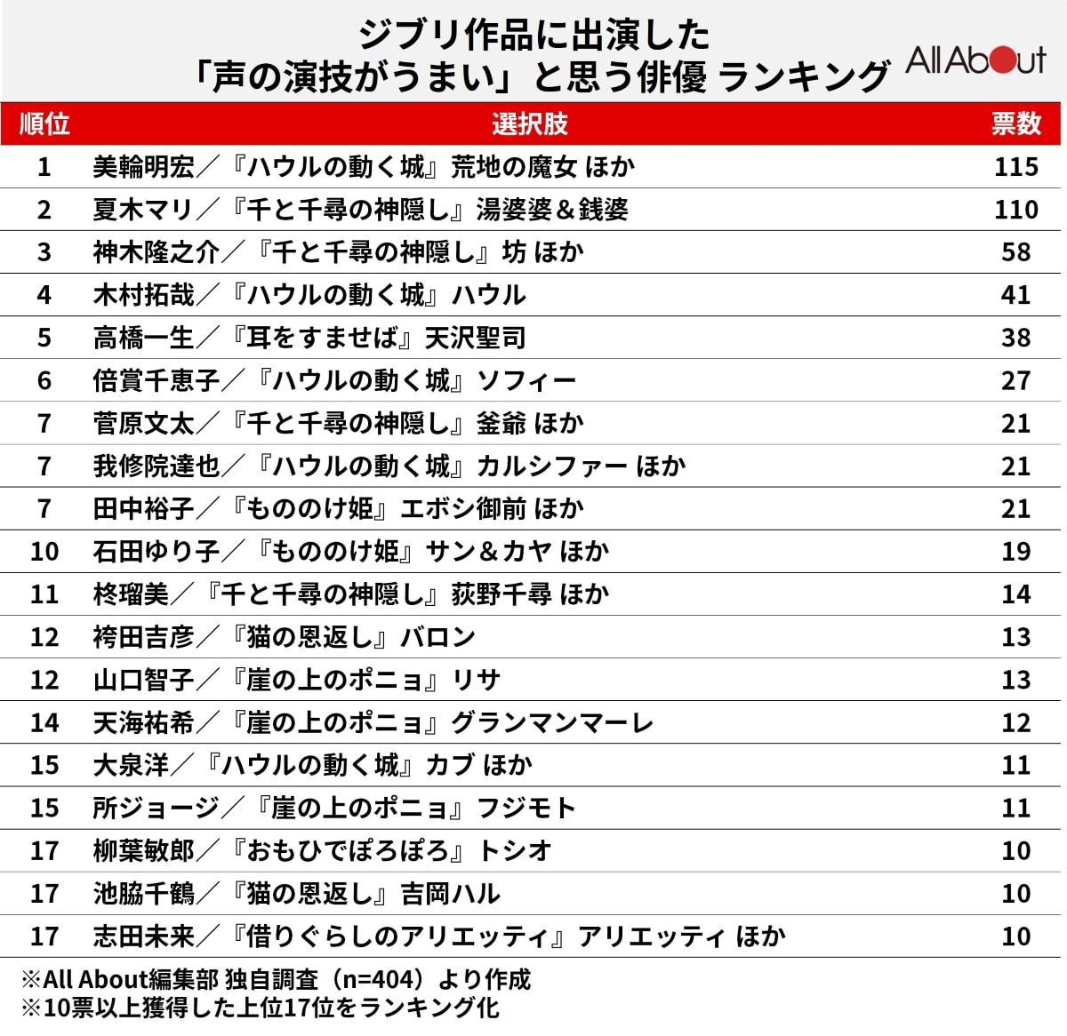 なんとも意外(!?)な結果に。実は、声優以外にもジブリ映画のキャッチコピーを何作も糸井は手がけている。『もののけ姫』の「生きろ」、『千と千尋の神隠し』では「トンネルのむこうは、不思議の町でした。」そして、『となりのトトロ』も、「このへんないきものはまだ日本にいるのです。たぶん。」