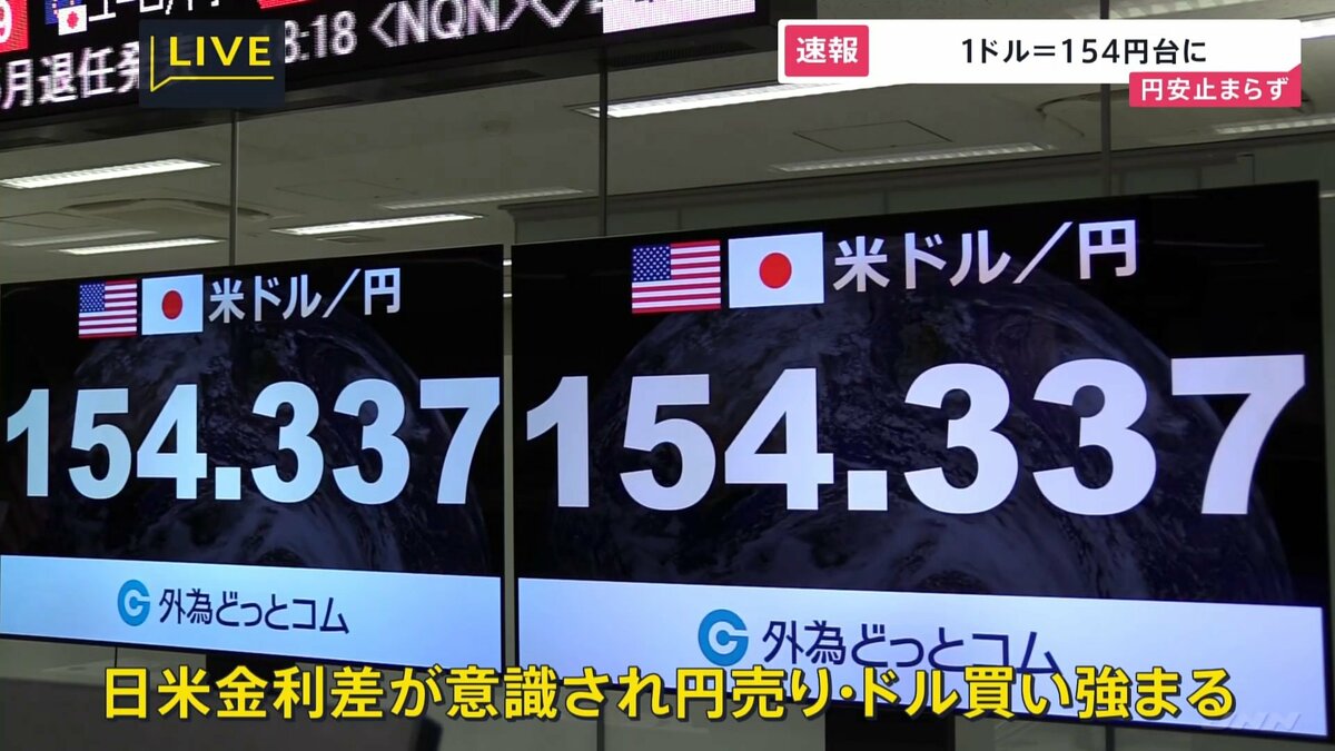 先ほど、円相場は1ドル=154円台をつけ、34年ぶりの円安水準をまた更新しました。