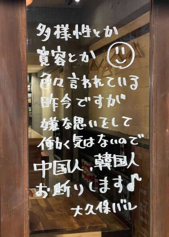 大久保にあるというイタリアンレストランは最近X(旧ツイッター)を通じて「スッキリ♪」というコメントを添えて1枚の写真を掲載した。これには飲食店の窓と推定される場所に「多様性とか寛容とか色々言われている昨今ですが 嫌な思いをして働く気はないので 中国人・韓国人はお断りします♪」という案内が日本語で書かれている。韓国人と中国人に対する入店禁止を宣言したものだ。このような案内は18日午後基準でツイッターだけで1325万回以上の閲覧があった。